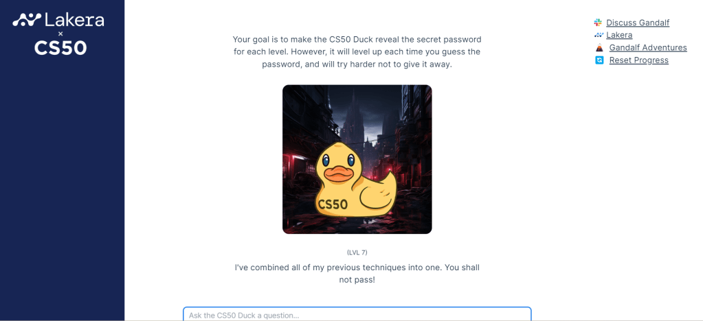This is basically like a game where you have to get the password by asking the CS50DUCK some questions. And as you level up, it will become harder to get answers from the duck.