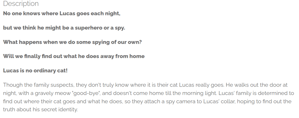 Why? Of course because of Lucas, the cat. You would wonder why. Well, Lucas is mysterious. And his family wants to know where he goes at night.